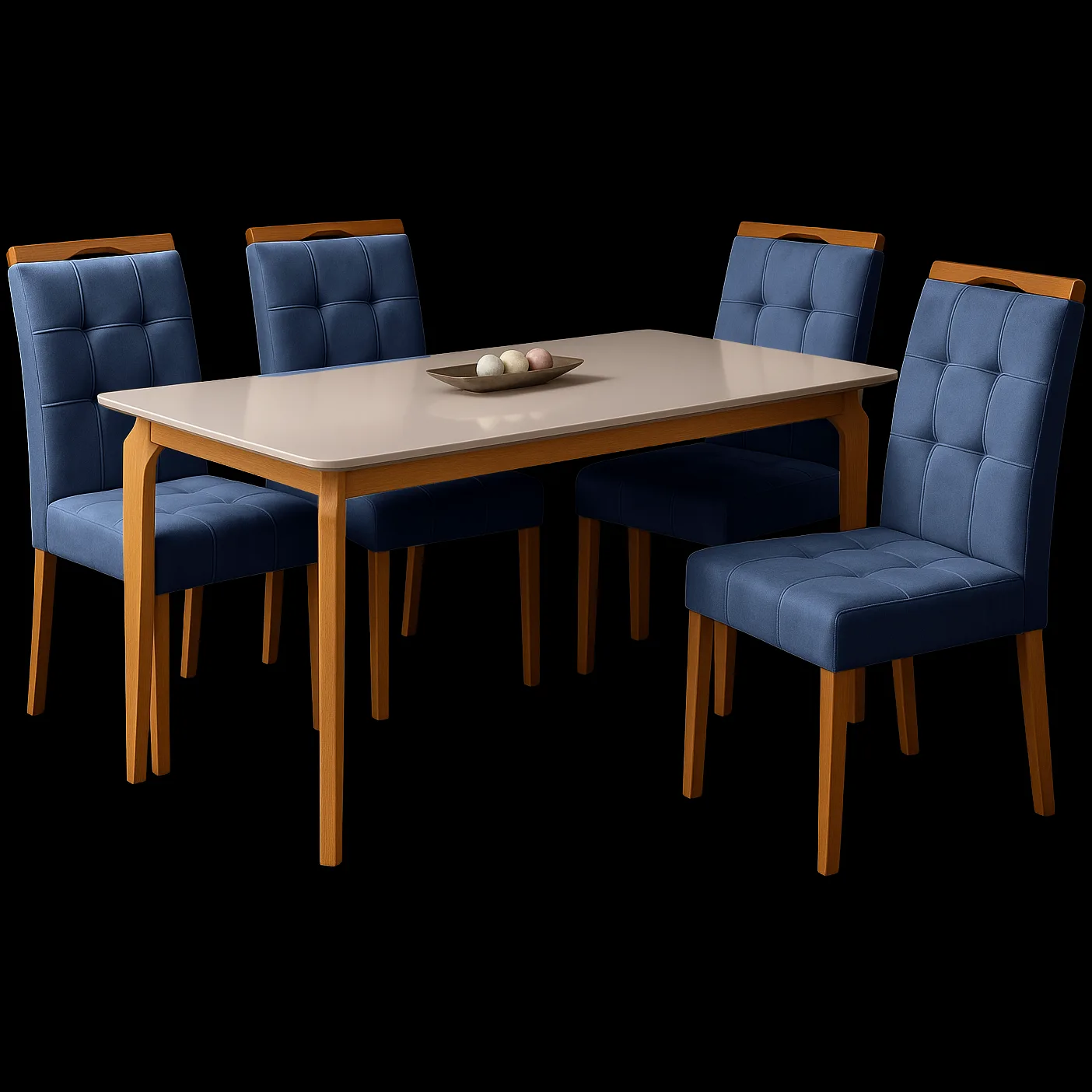 Mesa Alegra 120 Cinamomo/Off White com 4 Cadeiras Sophia Veludo Azul – JCM MOVELARIA + WM DECOR