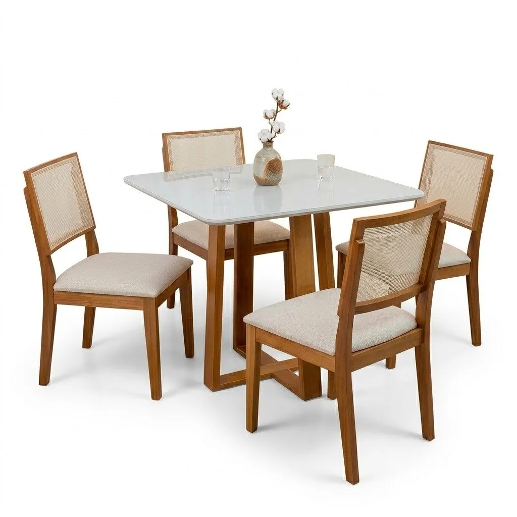 Mesa Pedro 90 Mel/Off White com 4 Cadeiras Dubai Mel/Linho Bege 614 – ART ASSENTOS