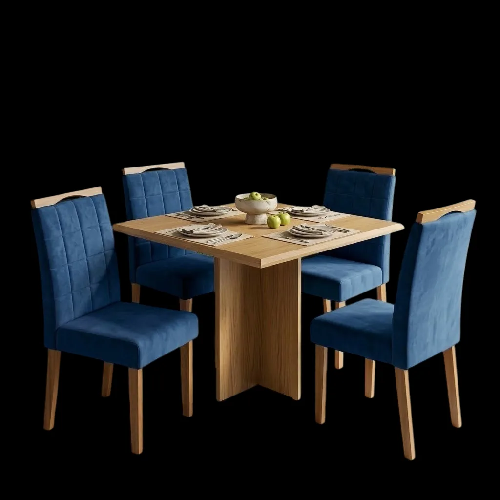Mesa Pérola 90 Imbuia Mel (Tampo Viena s/vidro) com 4 Cadeiras Las Vegas Veludo Azul 24 – CARVALHO DECOR + OURO DECOR