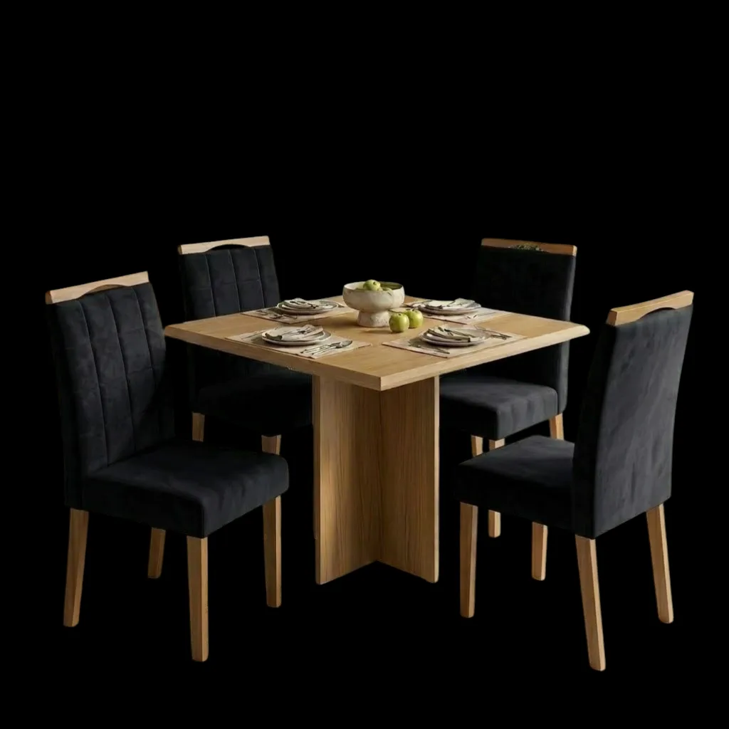 Mesa Pérola 90 Imbuia Mel (Tampo Viena s/vidro) com 4 Cadeiras Las Vegas Veludo Preto 13 – CARVALHO DECOR + OURO DECOR