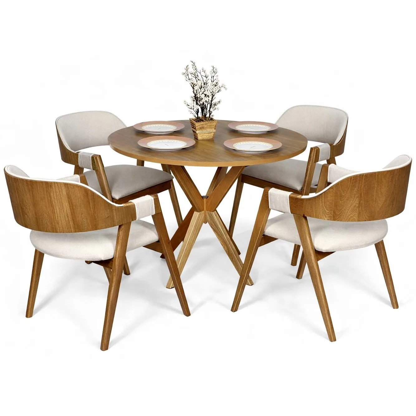 Mesa Redonda Simpatia 108 Cinamomo com 4 Cadeiras Pérola Linho Areia – JCM MOVELARIA + WJ DECOR