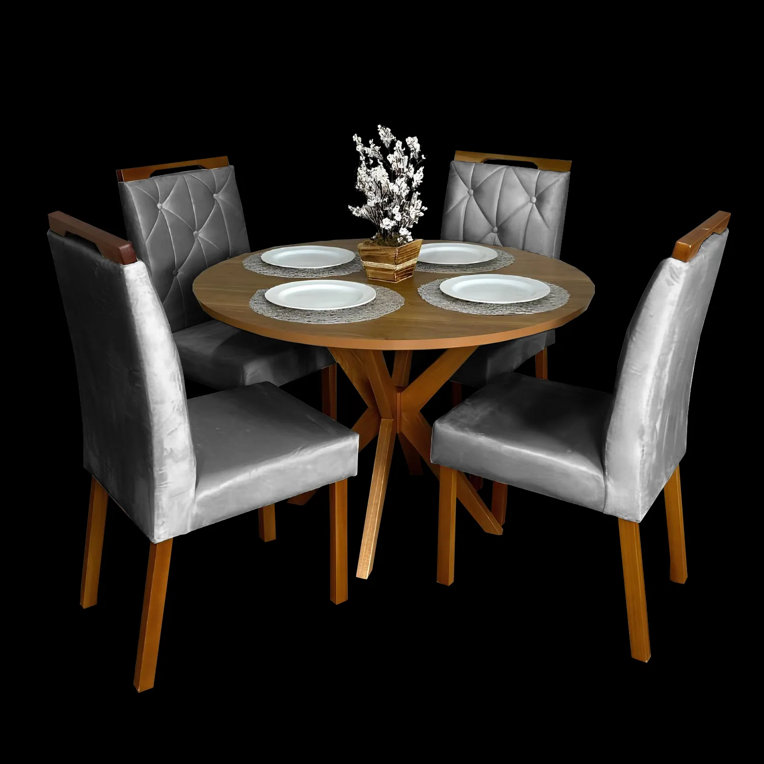 Mesa Redonda Simpatia 108 Cinamono com 4 Cadeiras Yasmim Veludo Cinza Grafite – JCM MOVELARIA + KM DECOR