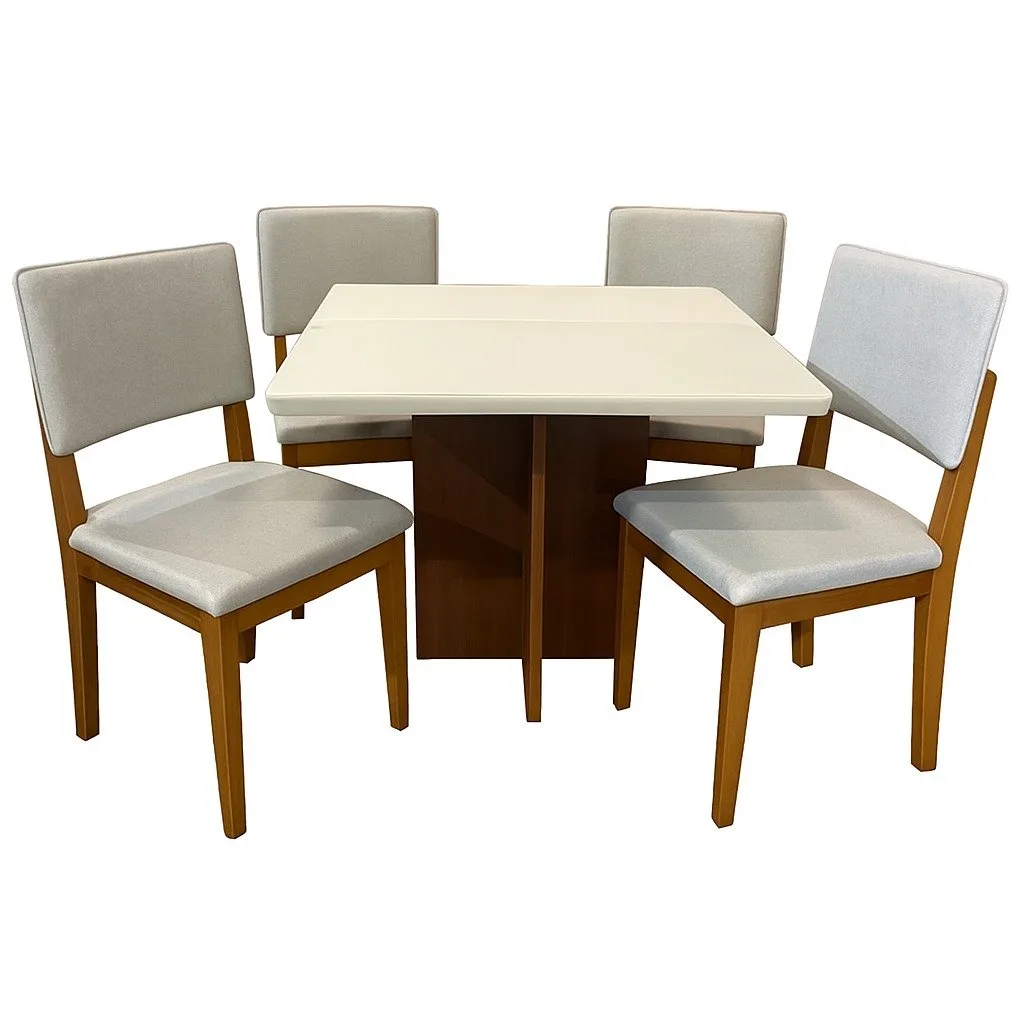 Mesa Salinas 90 Cinamomo/Off White com 4 Cadeiras Pérola Linho Cinza Prata – CEL MÓVEIS + DOBUÊ MOVELARIA