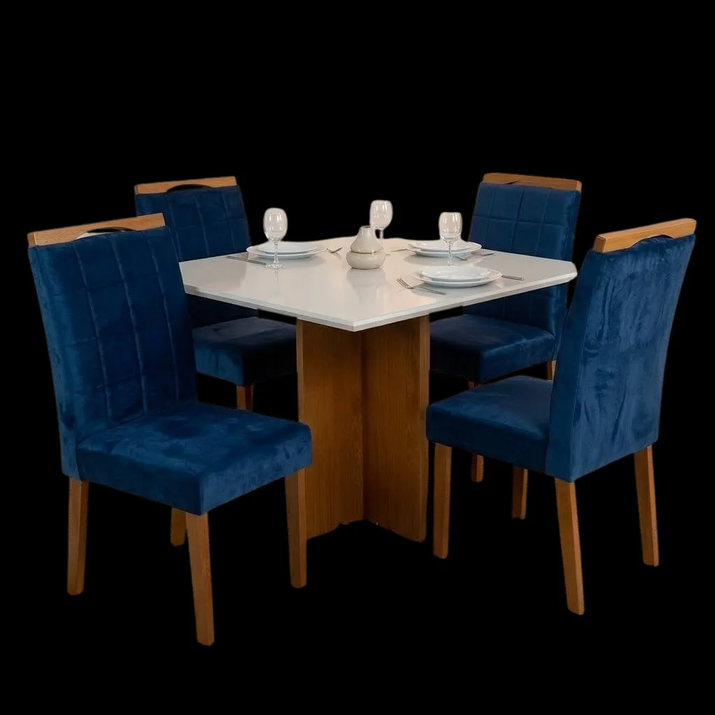 Mesa Salinas 90 (Tampo Dakota c/vidro) Cinamomo/Off White com 4 Cadeiras Las Vegas Veludo Azul 24 – CEL MÓVEIS + OURO DECOR