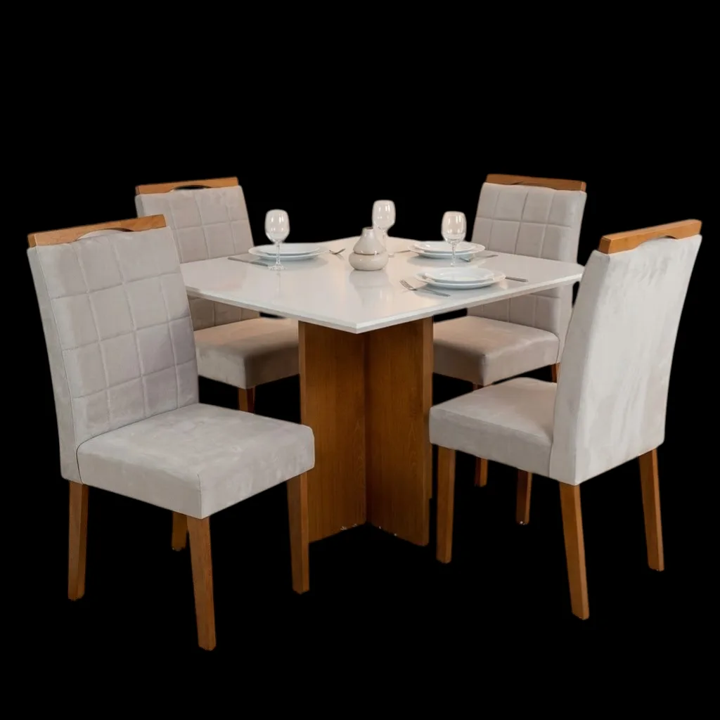 Mesa Salinas 90 (Tampo Dakota c/vidro) Cinamomo/Off White com 4 Cadeiras Las Vegas Veludo Bege 01 – CEL MÓVEIS + OURO DE