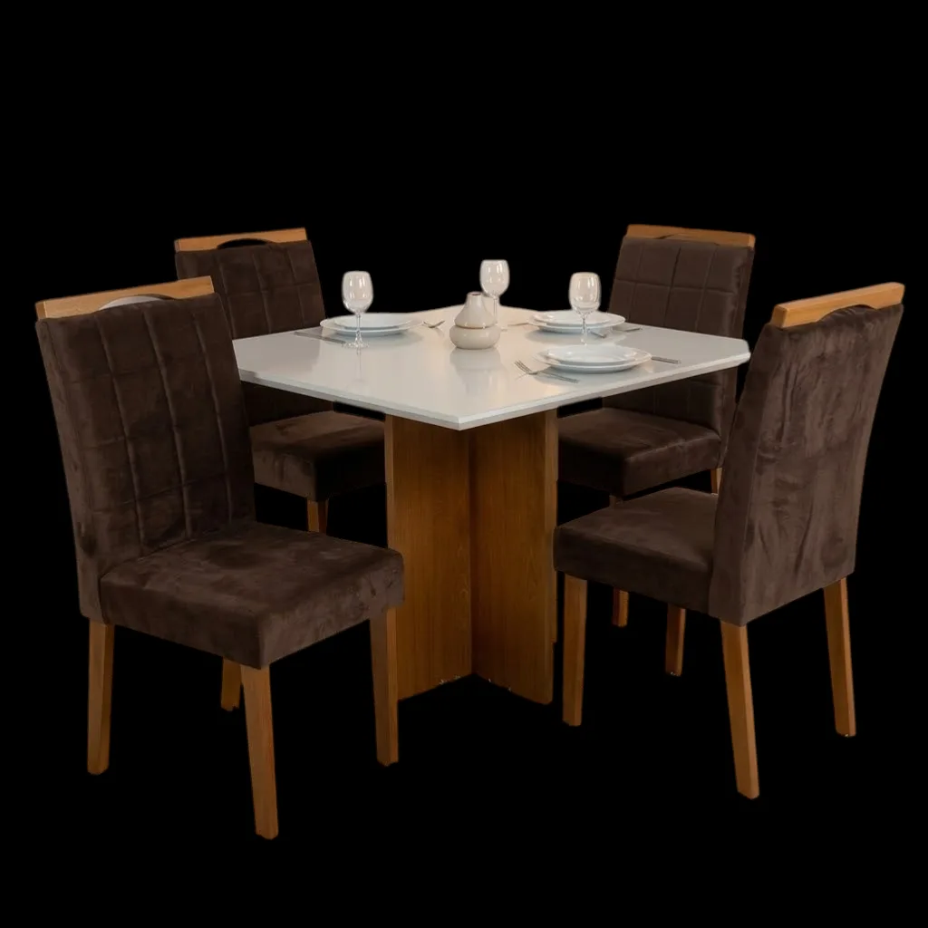 Mesa Salinas 90 (Tampo Dakota c/vidro) Cinamomo/Off White com 4 Cadeiras Las Vegas Veludo Marrom 17 – CEL MÓVEIS + OURO DECOR