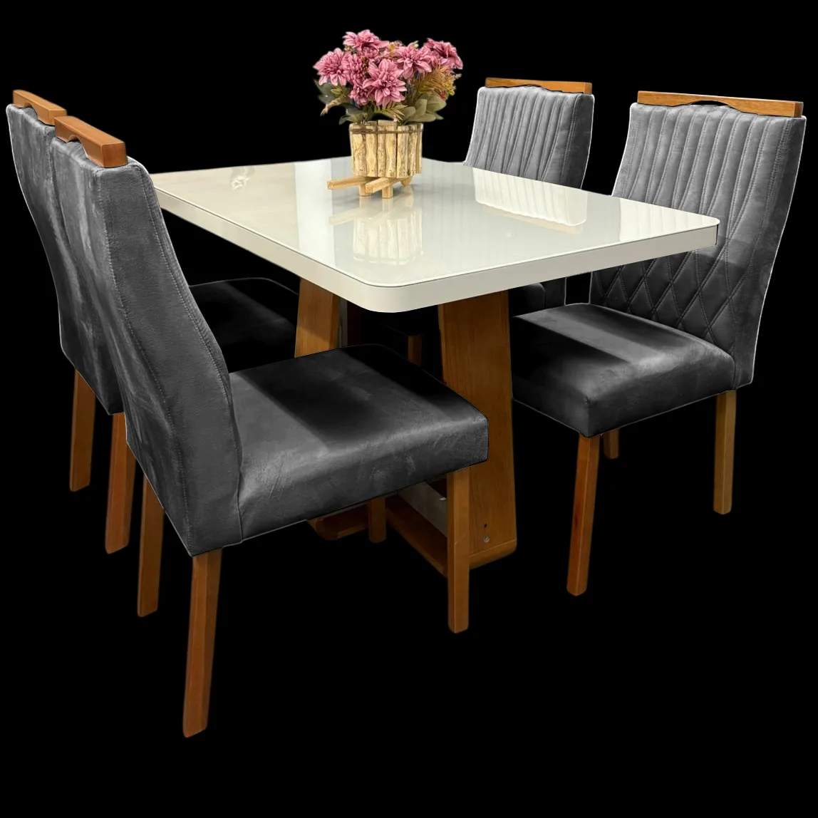 Mesa Sintonia (Tampo Maxi) 120 Amêndoa Clean/Off White com 4 Cadeiras Gênova Veludo Grafite – LOPAS + ART ASSENTOS