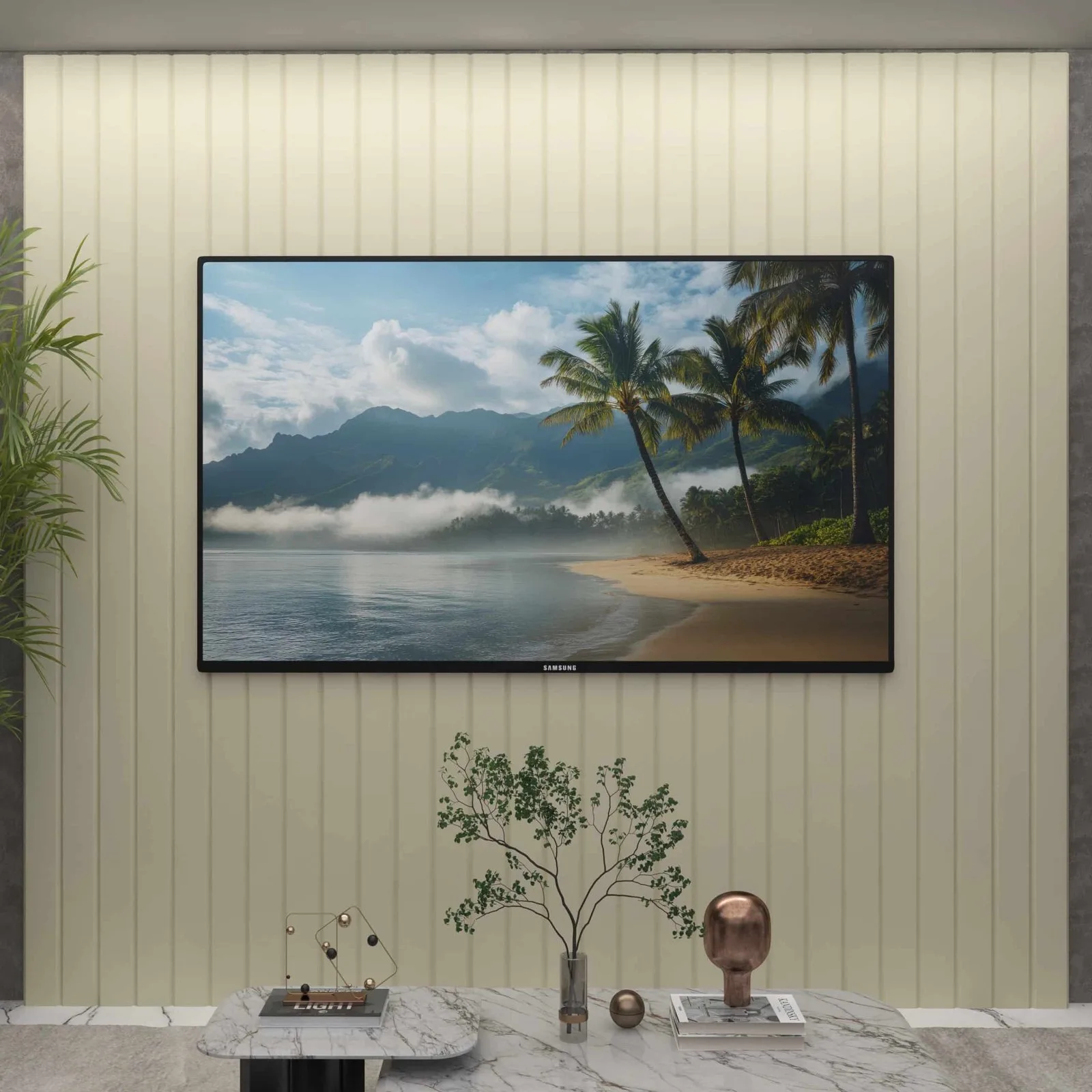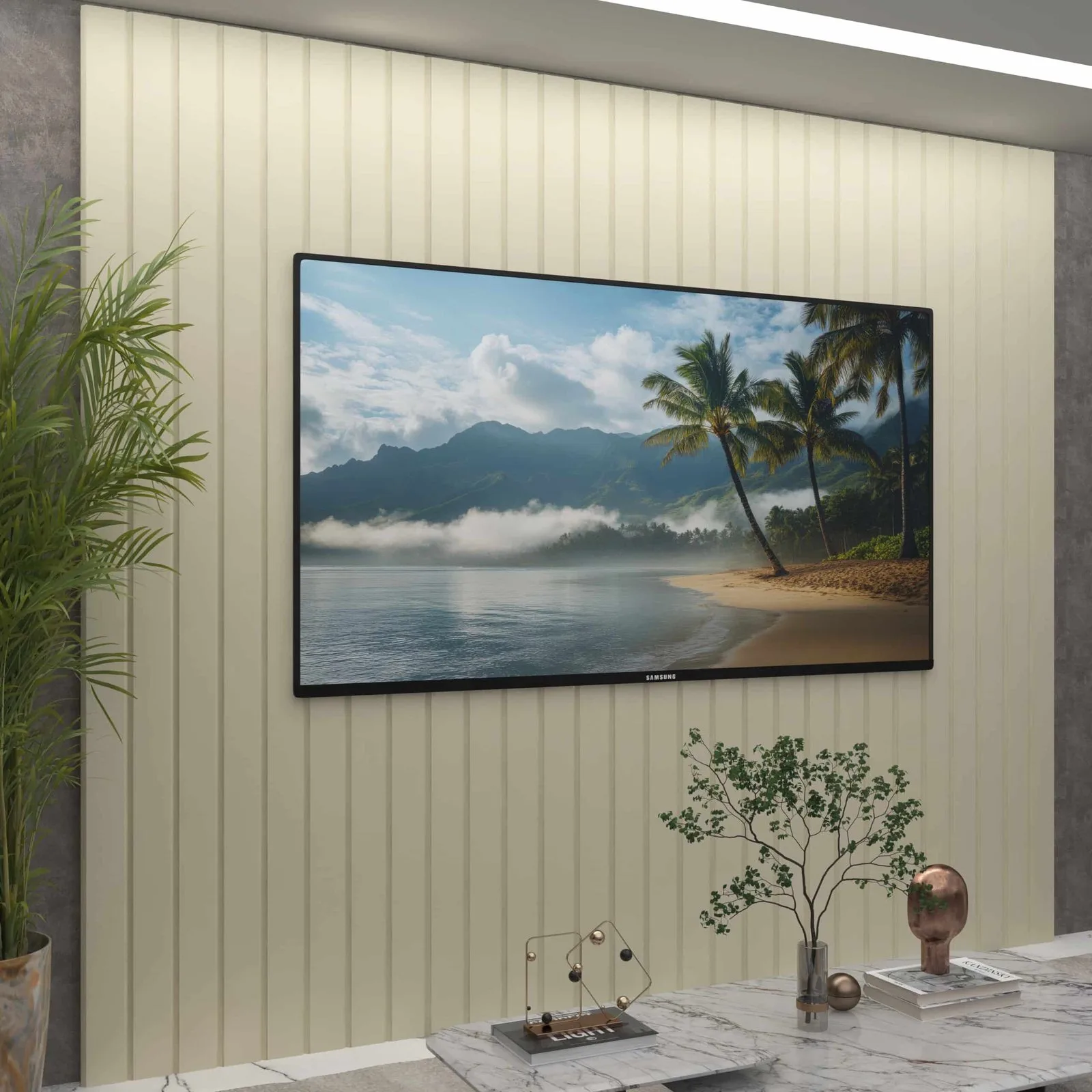 – Design com painel contínuo, permitindo melhor alinhamento visual da TV ao conjunto