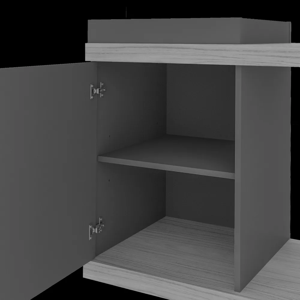 – Acabamento madeirado em pintura UV texturizada, Grafite em pintura UV acetinada, e Off White em pintura UV alto brilho